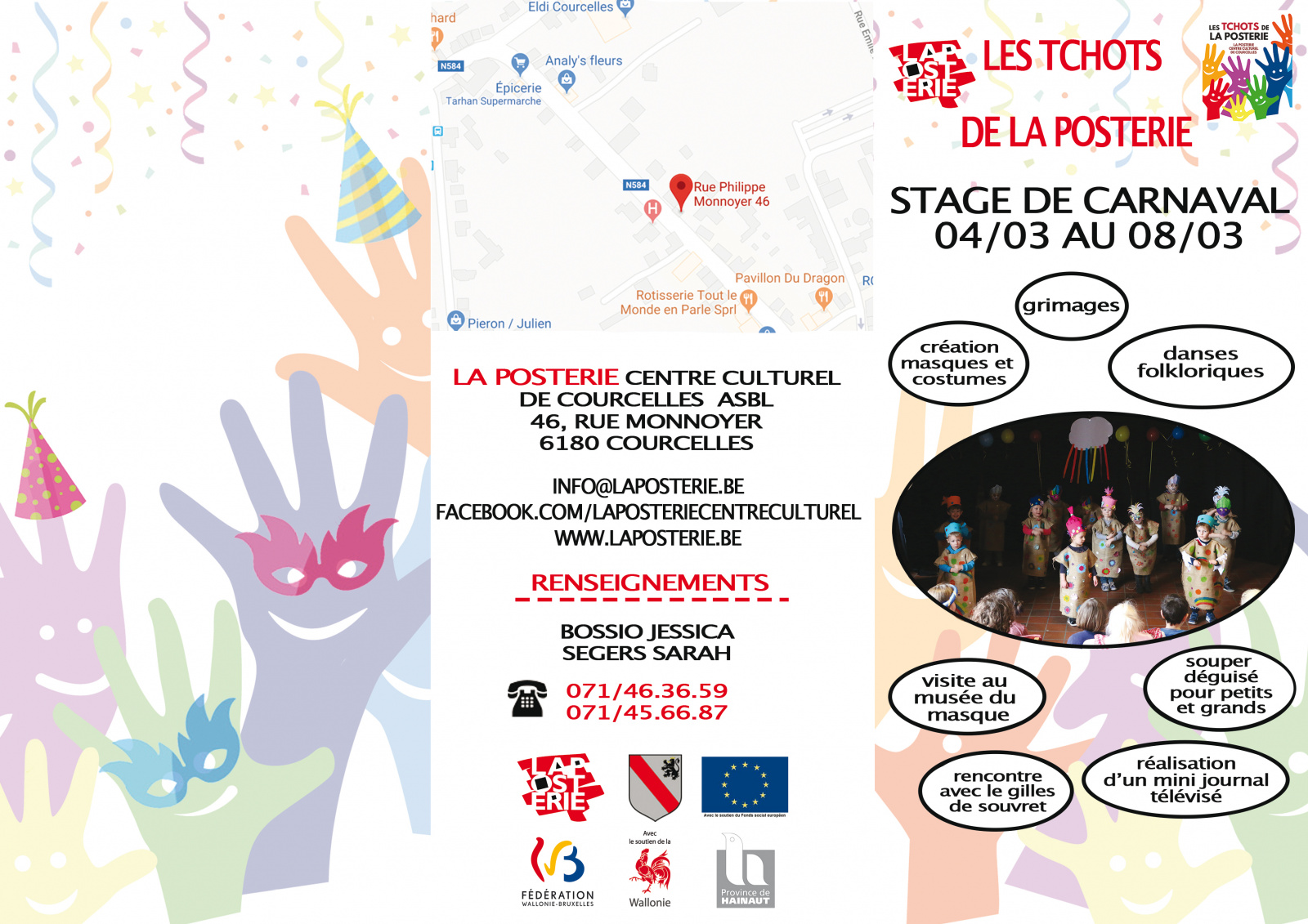 Inscrivez vos enfants à notre stage des vacances de Carnaval ! Au programme : création de costumes Souvretois, grimage, création de noeuds papillon (petits) / création de costumes Trazegniens, danses folkloriques, quizz (moyens) / réalisation d'un reportage sur les gilles de Gouy-lez-Piéton, création de costumes (grands).