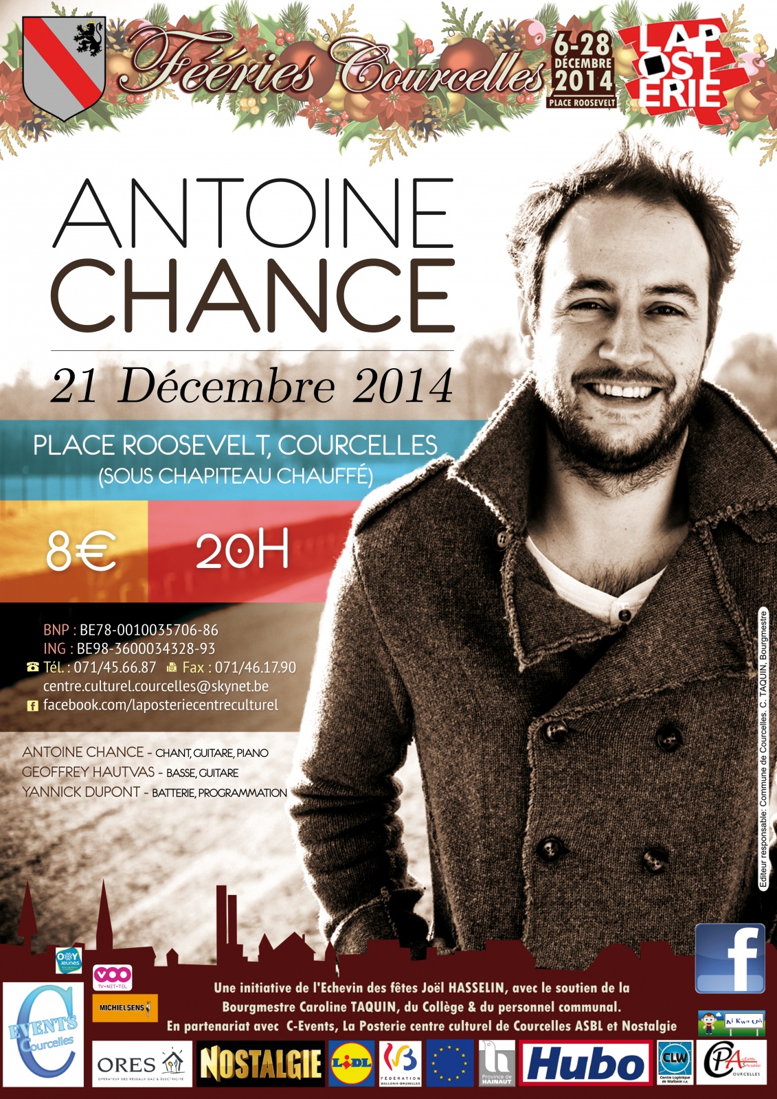 « Antoine Chance se produira en concert dans le cadre des Fééries de Courcelles le 21 décembre 2014 à 20h (P.A.F. : 8€). Le jeune et belge musicien Antoine Chance ajoute son nom porte-bonheur à la famille des meilleurs espoirs de la chanson. Biberonné à la pop des Beatles, à la mélancolie des Anglo-saxons et au lyrisme sobre des Innocents et d'Alain Souchon, il honore ses amours sur un premier album solo au charme fou, qu'il a réalisé à Paris sous la houlette du magicien Renaud Létang (Feist, Alain Souchon). Pour mettre en musique des textes que lui ont écrits les plus grands (Jacques Duvall, Marcel Kanche), Antoine Chance a réuni une belle famille de musiciens (Craig Walker d'Archive, Ludovic Bruni, Vincent Taeger) et ainsi arrangé un écrin pop de toute beauté, qui relie la France d'Alain Chamfort à l'Angleterre de Coldplay. Des chansons à la mélancolie douce et la poésie désarmante, portées par des mélodies attachantes, de la chance pour toutes les oreilles. »