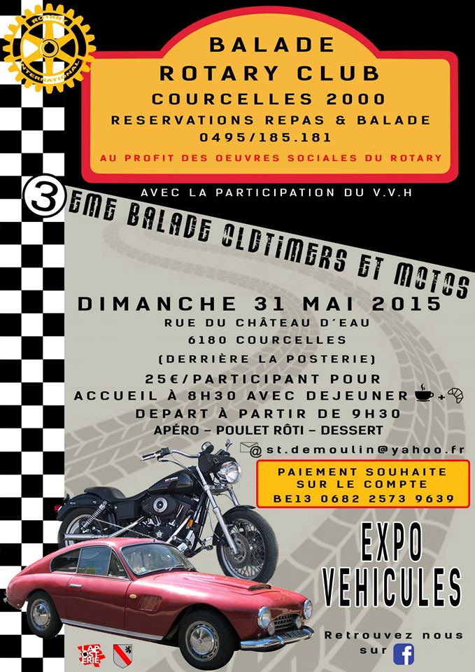 Le Rotary Club Courcelles 2000 organise sa 3ème balade oldtimers et motos, avec la participation du VVH, le dimanche 31 mai 2015, rue du Château d'Eau à Courcelles (derrière la Posterie).