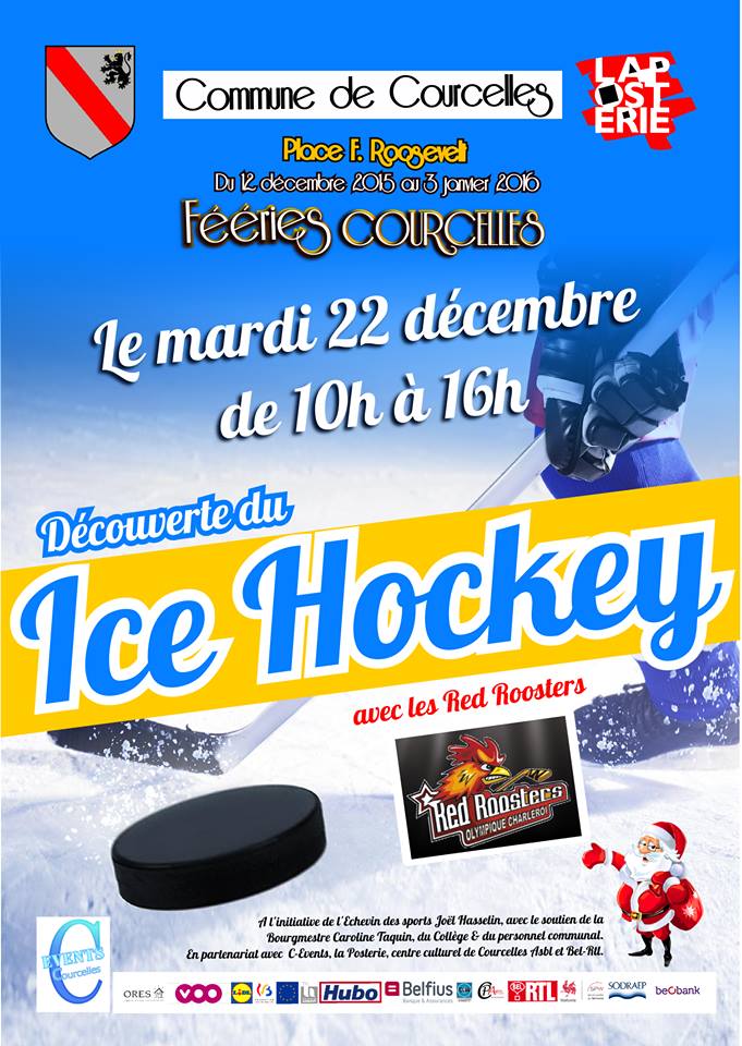 Dans le cadre des Fééries de Courcelles, venez-vous essayer au hockey sur glace, le mardi 22 décembre sur la patinoire en glace de la place Roosevelt de 10 à 16 heures.