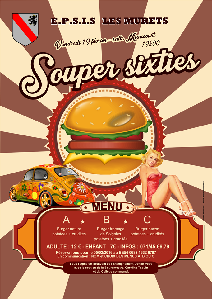 L'école de l'Epsis "Les Murets" organise un souper sixties, le vendredi 19 février 2016 à 19h00 à la salle de Miaucourt à Courcelles :)