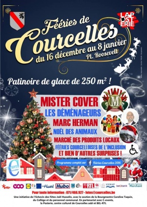 Du vendredi 16 décembre 2016 au dimanche 8 janvier 2017, vivez la magie de notre Marché de Noël à Courcelles ! Pour sa quatrième édition, la Commune de Courcelles remet le couvert ;) Dans une ambiance féérique, Courcelles revêt ses habits de fête pour vous accueillir dans une ambiance chaleureuse et magique. Venez nous rejoindre sur le marché de Noël pour faire le plein de rêves et de cadeaux. Installées sur la place Roosevelt, au cœur de la commune, les fééries de Courcelles accueilleront une quinzaine de chalets plus alléchants les uns que les autres, un sapin majestueux de 12 mètres de haut, des jeux d’hiver, …. Une vraie patinoire de glace sera installée sous chapiteau couvert pour le plus grand bonheur des petits mais aussi des grands enfants ;)