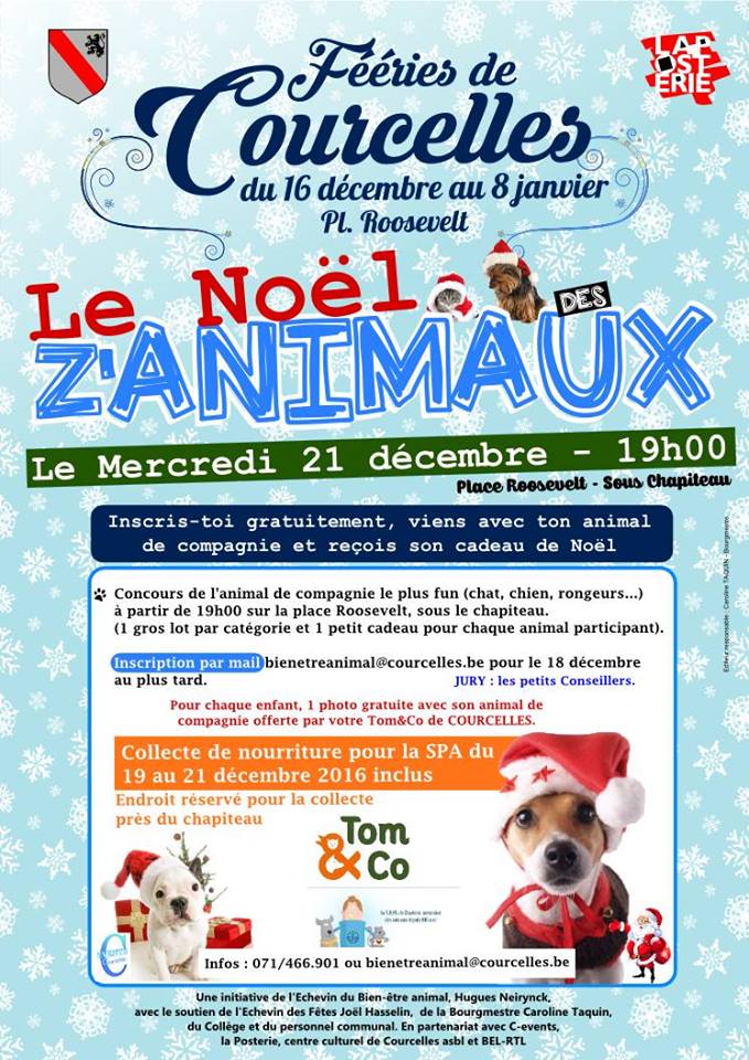 Dans le cadre des Féeries de Courcelles, nous vous invitons chaleureusement à venir nous rejoindre pour fêter le Noël des Animaux, le mercredi 21 décembre 2016 à partir de 19h00 sur la place Roosevelt :-)