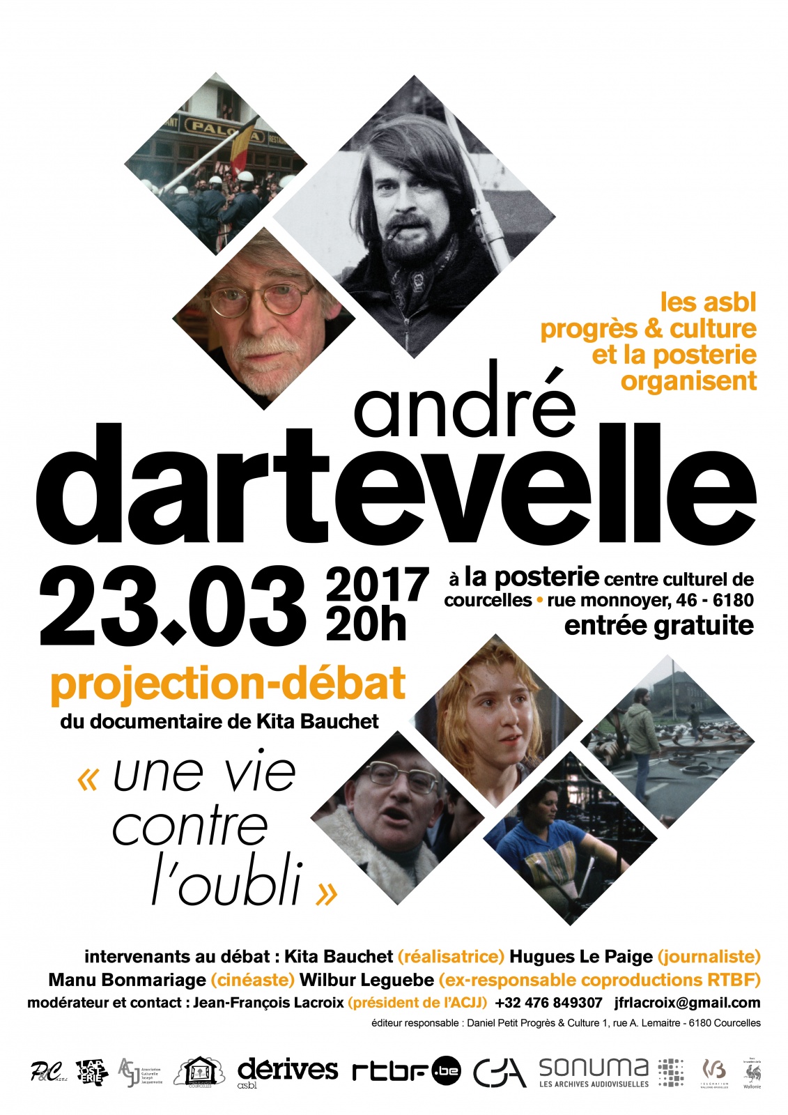 Le jeudi 23 mars 2017 à 20h, Progrès & Culture et La Posterie Centre culturel de Courcelles ASBL organisent à La Posterie une séance projection-débat à la mémoire d'André Dartevelle, journaliste, documentariste, producteur et réalisateur à la RTBF.