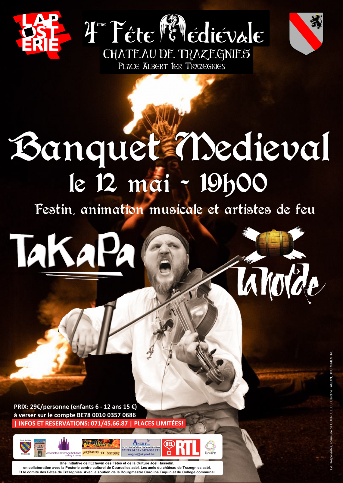Un banquet médiéval ripaille (repas + animations) inaugural se tiendra le vendredi 12 mai dans les différentes salles du Château de Trazegnies pour marquer le début de la 4ème édition de la fête médiévale comme il se doit et de ripailler et festoyer dans une ambiance conviviale !