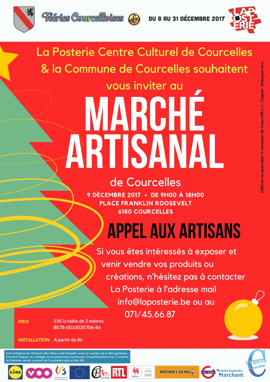 Un appel aux artisans est lancé ! Si vous êtes intéressés à exposer et venir vendre vos produits ou créations, n’hésitez pas à contacter La Posterie à l’adresse mail centre.culturel.courcelles@skynet.be ou au 071/45.66.87, du lundi au vendredi de 9h à 16h30. Nous serions ravis de vous compter parmi nous lors de cette grande fête ! Pour les informations pratiques : un montant de 15€ par table de 2 mètres est demandé et votre installation pourra se faire à partir de 8h.