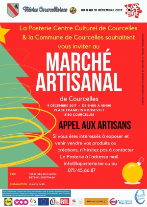 A l’occasion des fêtes de fin d’année, La Posterie Centre culturel de Courcelles souhaite vous inviter à son marché artisanal qui se déroulera le 9 décembre 2017 de 9h à 18h dans le cadre des Fééries de Courcelles. Une occasion pour venir vous promener en famille entre nos stands, de découvrir des créations ou des produits artisanaux diversifiés et ainsi effectuer vos derniers achats de Noël. N’hésitez donc pas à nous rejoindre le 9 décembre à la Place Roosevelt, sous un chapiteau chauffé.