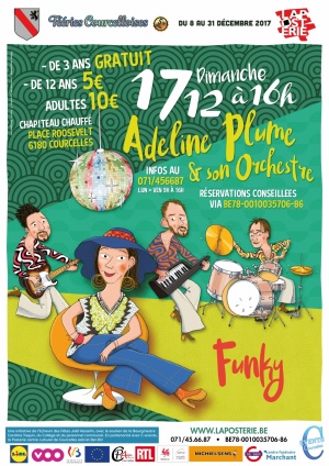 Un spectacle funky pour les enfants par le créateur des Déménageurs ! Adeline Plume est une chanteuse qui aime partager son énergie avec son public. Ses musiciens l’accompagnent sur le rythme très funky des chansons de son répertoire. Dans une ambiance musicale seventies, Adeline Plume et son orchestre chantent des moments d’enfance comme le besoin de danser, le grand dilemme du rose pour les garçons ou encore la colère de ne pas pouvoir jouer au lieu d’aller se brosser les dents.