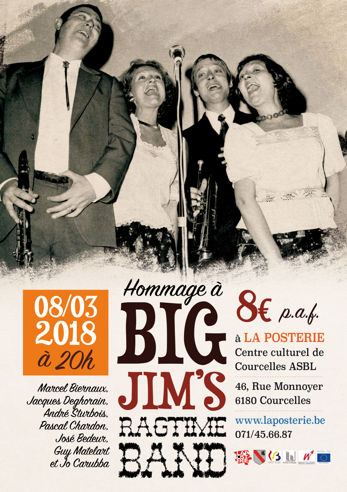 Rendez-vous le jeudi 08 mars à 20h pour une soirée en hommage au Big Jim's Ragtime Band ! Quelques anciens musiciens monteront sur le podium (avec d’autres) pour vous faire revivre en direct l’ambiance New Orleans du Big Jim’s Ragtime Band et cela durant 2 passages de 60 minutes !