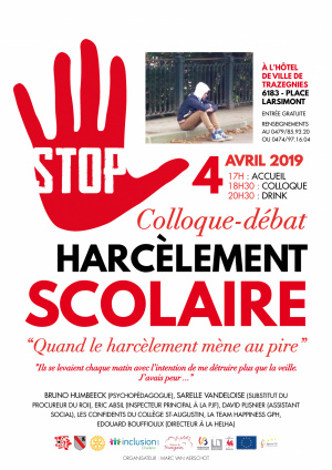 Nous organisons un colloque sur le HARCÈLEMENT SCOLAIRE prochainement à l'hôtel de ville de Trazegnies - le 4 AVRIL !! Parce que des solutions existent, n'hésitez pas à venir écouter les différents interlocuteurs professionnels lors de ce colloque !