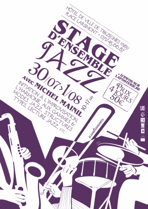 Envie de vous initier à l'improvisation, l'harmonie jazz, aux gammes et modes jazz, structures types, à la lecture jazz ? Vous pouvez dès à présent vous inscrire pour le stage d'ensemble jazz animé par le saxophoniste Michel Mainil du 30 juillet au 2 août à l'Hôtel de Ville de Trazegnies. Le stage est accessible à tout instrumentiste possédant un niveau musical moyen ou avancé (minimum 3 ans de pratique instrumentale et ayant des bases de lecture et d'harmonie). Les participants apportent leur instrument en état de marche, un pupitre, du papier à musique et de quoi écrire. Concert de clôture des participants le 1 août à 20h à LA POSTERIE (46, Rue Monnoyer - 6180 Courcelles - entrée gratuite) !