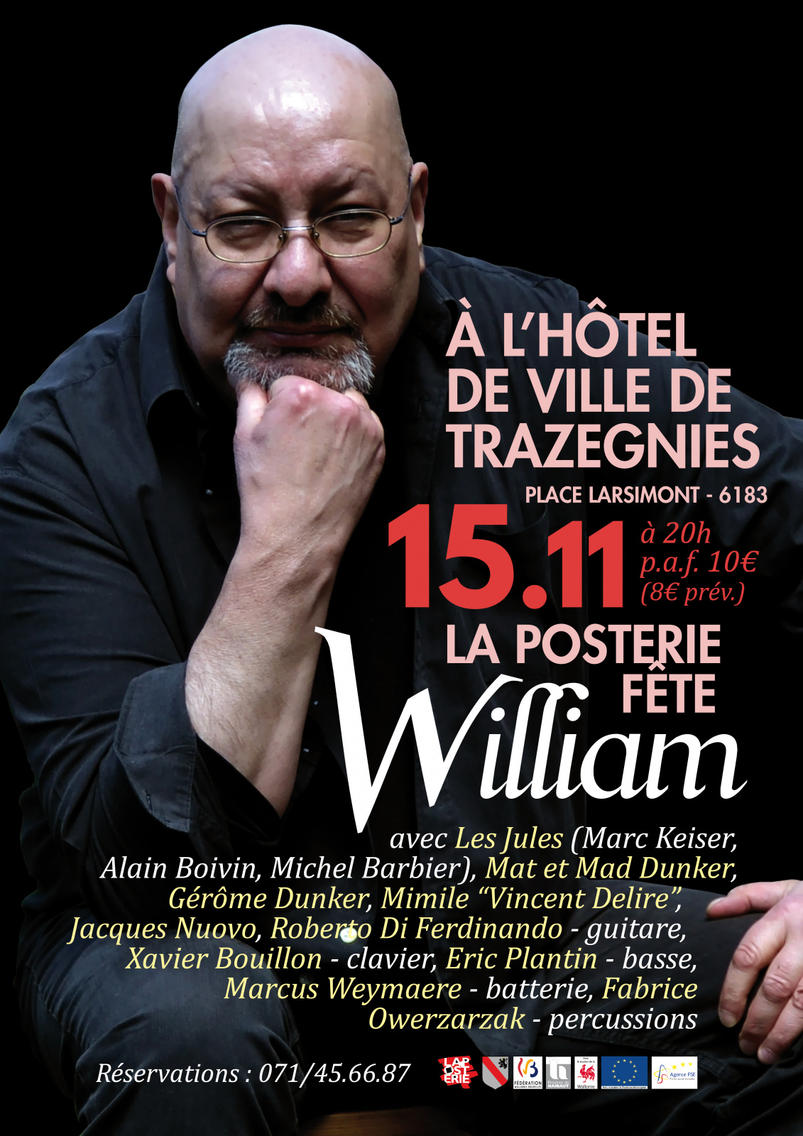 Venez fêter William Dunker avec nous à l'Hôtel de Ville de Trazegnies le vendredi 15 novembre à 20h ! Avec Les Jules (Marc Keiser, Alain Boivin, Michel Barbier), Mat et Mad Dunker, Gérôme Dunker, Mimile "Vincent Delire", Jacques Nuovo, Roberto Di Ferdinando - guitare, Xavier Bouillon - clavier, Eric Plantin - basse, Marcus Weymaere - batterie, Fabrice Owerzarzak - percussions