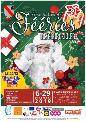 Du 6 au 29 décembre 2019, la Commune de Courcelles va enfiler son plus beau costume de Père Noël pour la 7ème édition des "Fééries". Retenez d’ores et déjà la date du 6 décembre pour le lancement des festivités. De nombreuses activités, animations et spectacles de qualité vont égayer la place Roosevelt, sans oublier la patinoire et les chalets où vous retrouverez l’odeur du sapin et du chocolat chaud, des confiseries, mais aussi de la tartiflette, de la raclette, des grillades et des traditionnels pekets,…