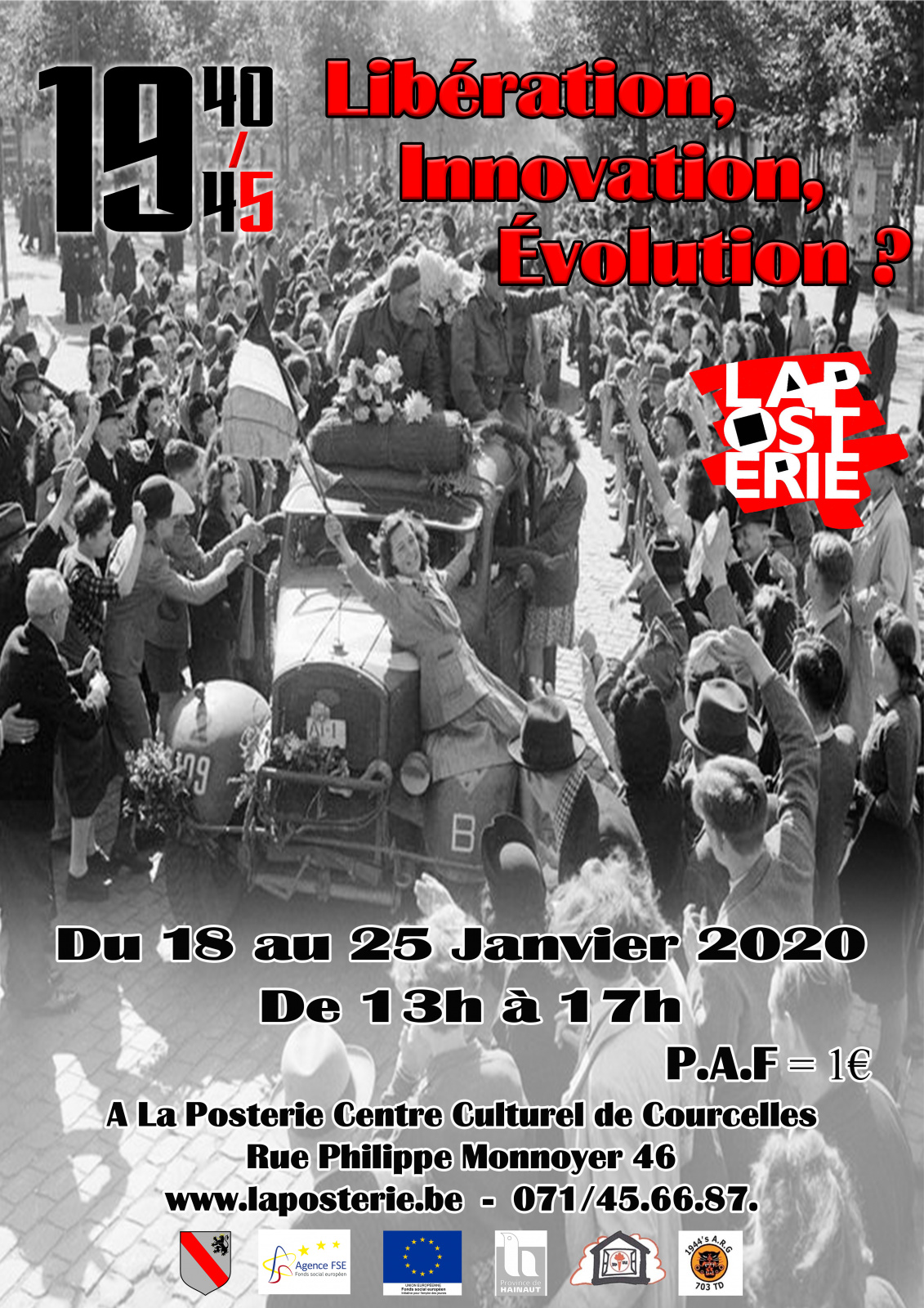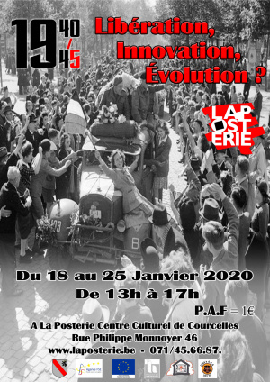 La Posterie Centre Culturel de Courcelles, en collaboration avec "1944’s allied remembrance group 703TD" et le Cercle d'Histoire de l'entité de Courcelles ASBL, organise du 18 janvier au 25 janvier 2020, dans le cadre de sa formation multimédia et des métiers de la culture, l'exposition "1940/45 Libération, Innovation, Evolution ?". Venez decouvrir la libération de notre région, la vie dans un camp, les innovations militaires de l'époque et ce qu'elles nous ont apporté dans notre quotidien. Et bien d'autres choses....
