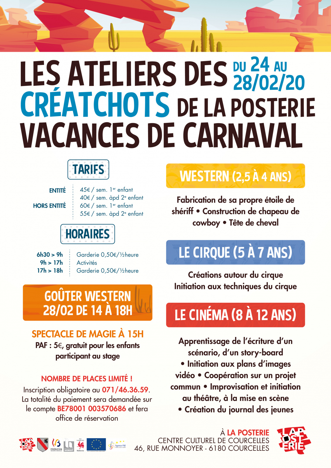 Inscription obligatoire au 071/46.36.59 et totalité du paiement demandée avant la semaine d'activités sur le compte BE78001003570686