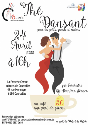 La Posterie Centre culturel de Courcelles ASBL vous invite nombreux à son thé dansant intergénérationnel ce dimanche 24 Avril 2022 à 16h, rue Monnoyer 46 à Courcelles !