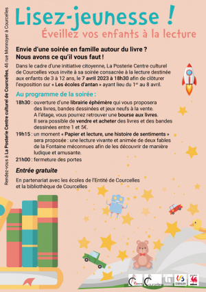 Dans le cadre d’une initiative citoyenne, La Posterie Centre Culturel de Courcelles vous invite à sa soirée consacrée à la lecture destinée aux enfants de 3 à 12 ans, le 7 avril 2023 à 18h30 afin de clôturer l’exposition sur les écoles d’antan ayant lieu du 1er au 8 avril.