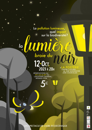 La Posterie est fière de vous présenter le 12 octobre prochain le spectacle "La lumière broie du noir", un spectacle qui sensibilise et interpelle sur les risques liés à la pollution lumineuse, raconté avec poésie et humour dans un univers métaphorique. C'est ce que promet de vous présenter Frédéric Jomaux et Lionel Liégeois avec leur spectacle "La lumière broie du noir", suivi d'un débat sur le thème abordé et les enjeux de société.