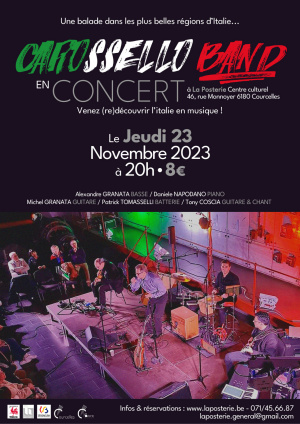 La Posterie vous propose un concert d’exception avec le groupe "Carossello Band" qui nous interprètera quelques-unes des plus belles chansons du répertoire de la musique italienne , le jeudi 23 novembre 2023 à 20h.