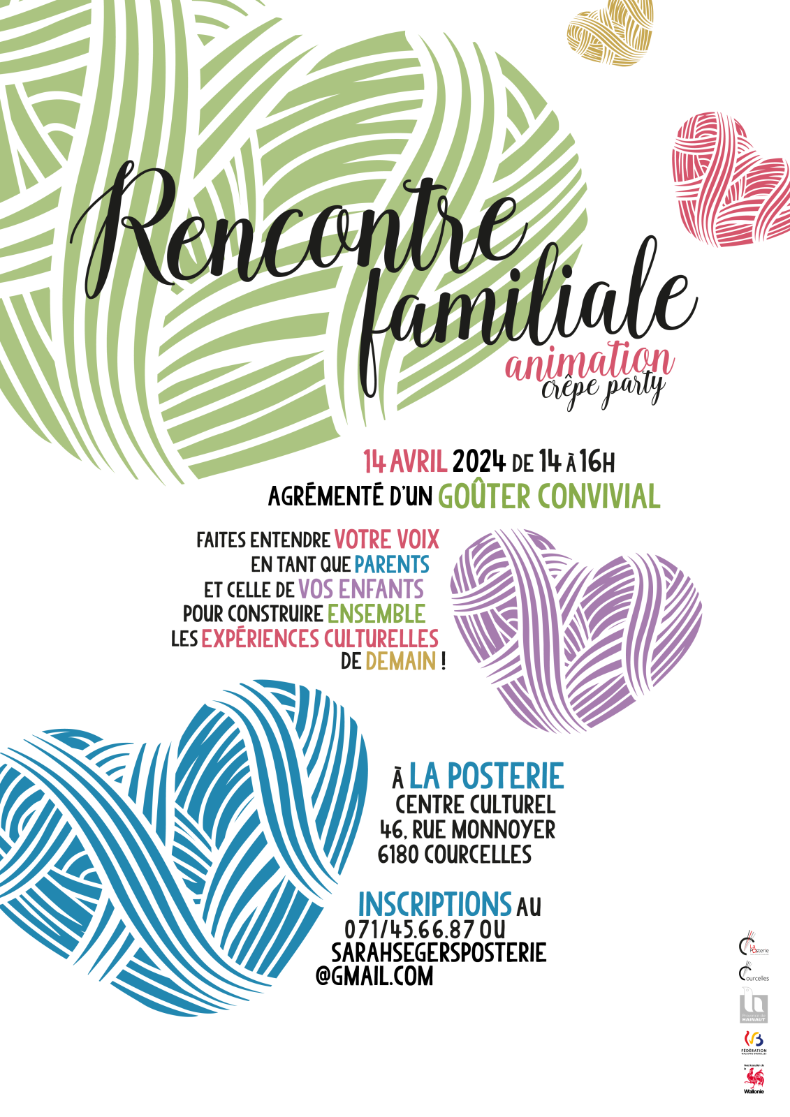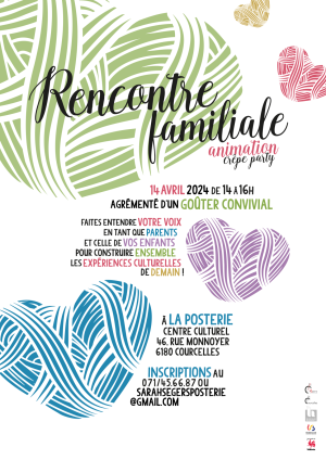 Rendez-vous le 14 avril de 14h à 16h pour une rencontre familiale à La Posterie Centre Culturel de Courcelles, 46 rue Monnoyer à 6180 Courcelles.
