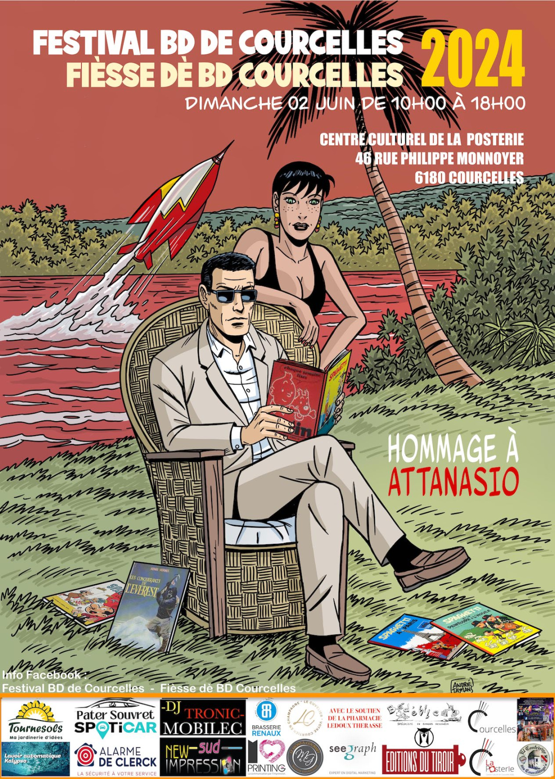 Le festival se tiendra le 02 juin 2024 à Courcelles. Les portes ouvriront à 10h, avec des séances de dédicaces prévues de 14h à 18h. De nombreux auteurs seront présents ! Hommage à Dino Attanasio. Ils seront entre 32 et 35 auteurs et dessinateurs !